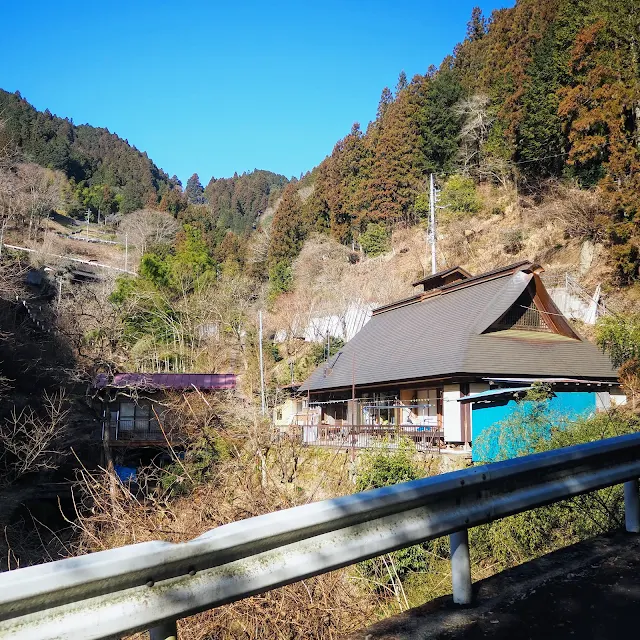 途中「え、こんなところに家あるの?」という感じの場所に数件民家があり、その先に上っていくつづら折れの道が見えます。