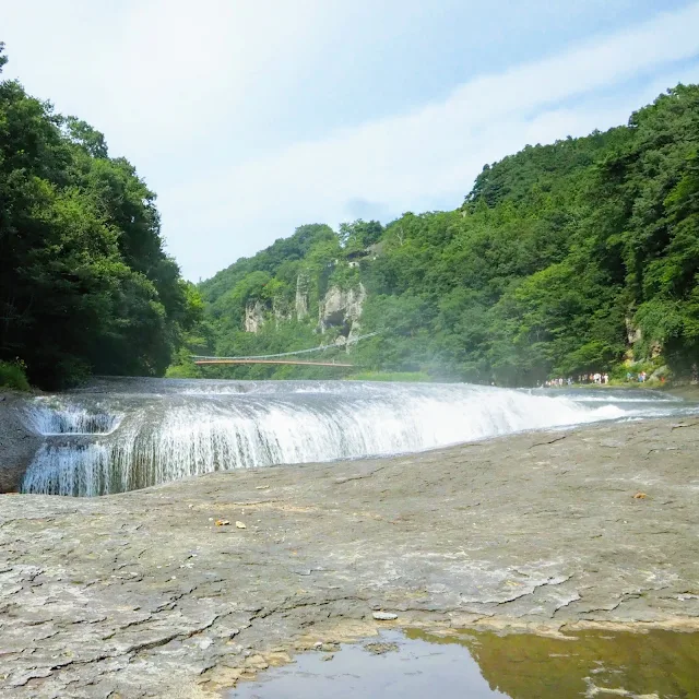 「東洋のナイアガラ」と称する「吹割の滝」。規模的には「群馬のナイアガラ」ぐらいが妥当な気がするU字状の断層の切れ目に勢いよく水が流れ落ちていきます。