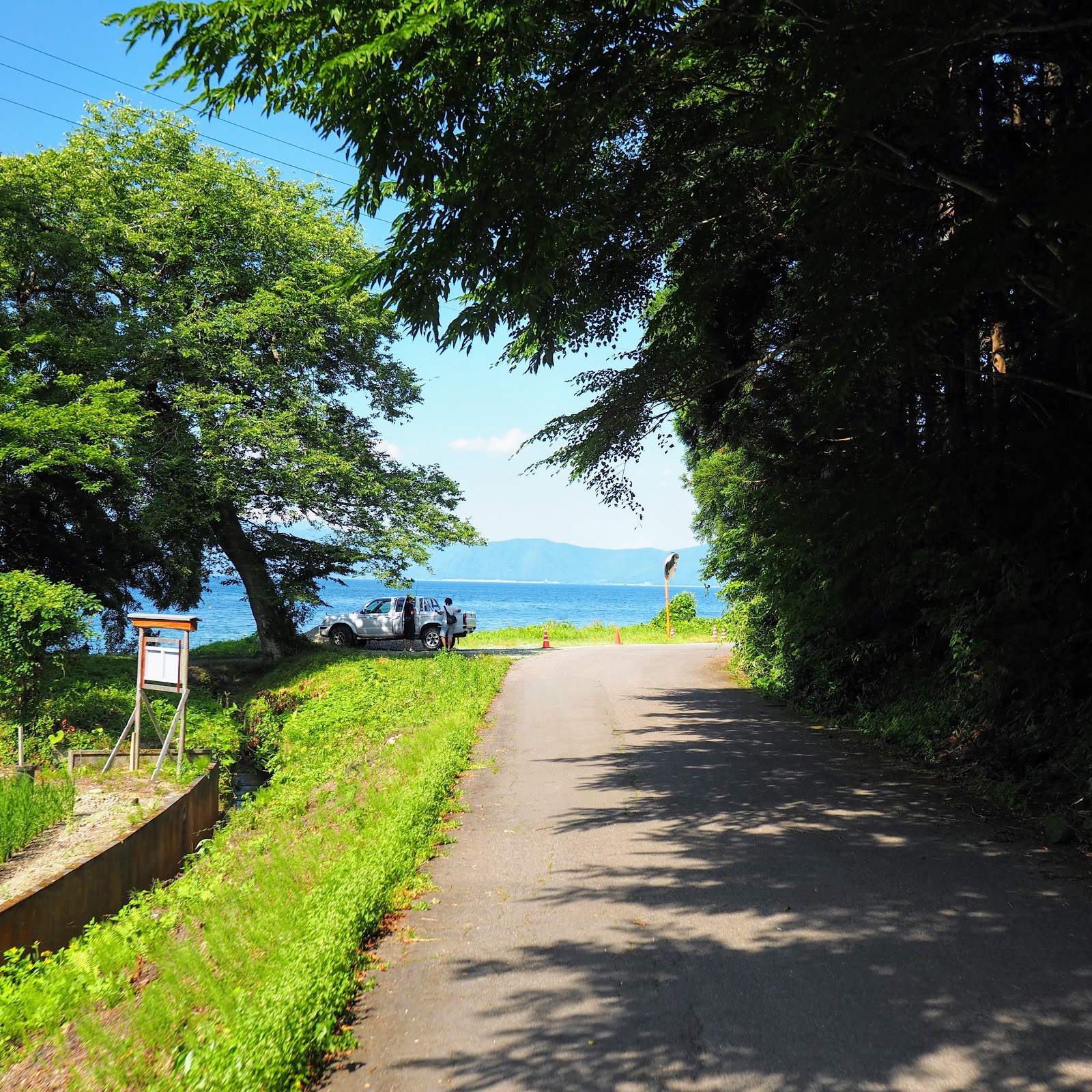 田んぼが広がるエリアに下りてきました駐車の列は崎川浜湖水浴場の前