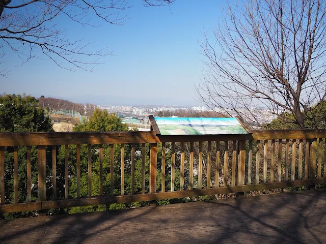 眼下に浅川が流れ、八王子の市街地の向こうに奥多摩~丹沢の山なみを見渡せます。