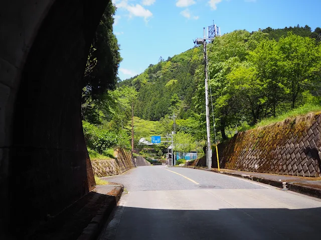 3~4%ぐらいのゆるい勾配をのんびり上っていきます。「白岩滝」バス停を左に入る。