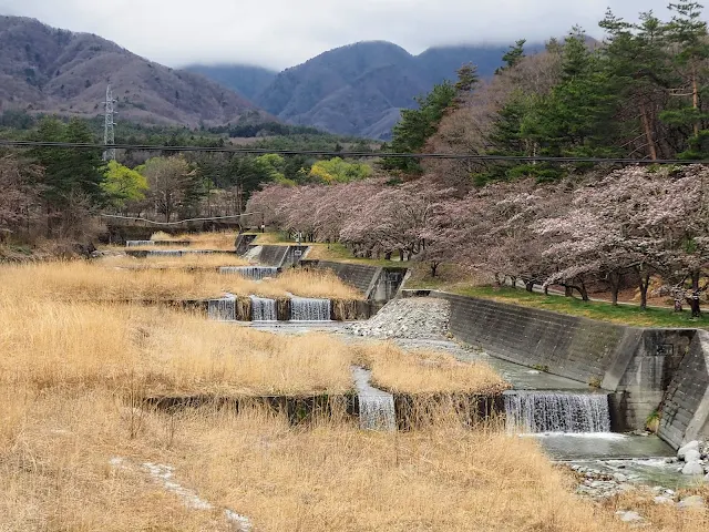 斜面の足もとには「水車の里公園」桜並木の坂を上っていくと