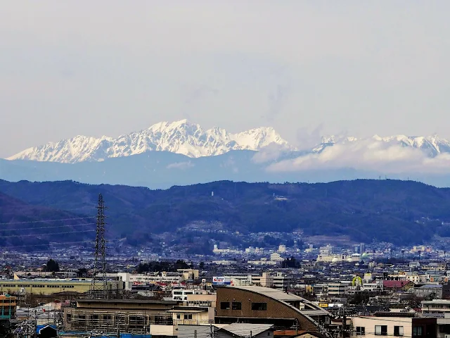 諏訪湖の向こうに北アルプスの山なみも見えます