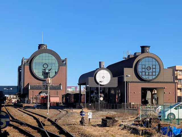 駅舎と「SLキューロク館」を南側から見ると巨大なSLのシルエットが3つ並んでいます